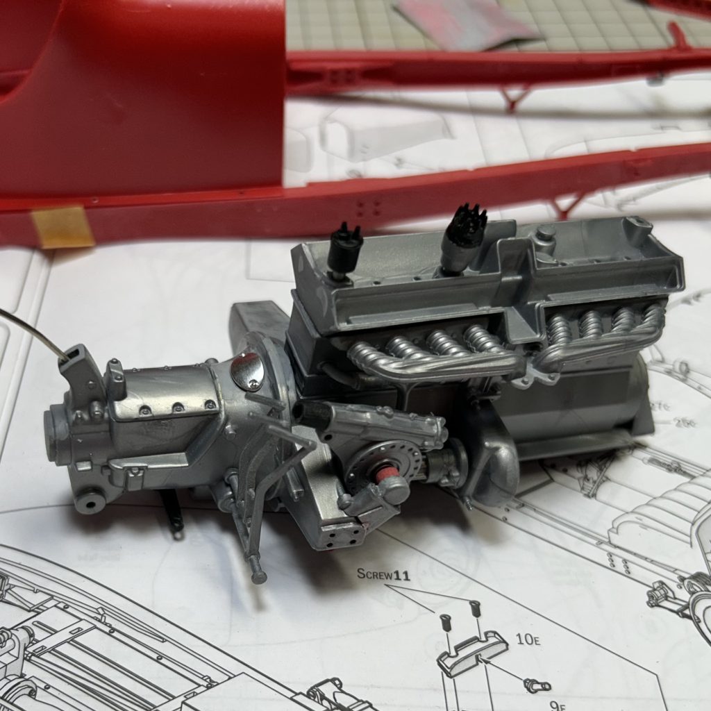 シャーシを組んだらエンジンパーツも組み上げて塗装していきます。